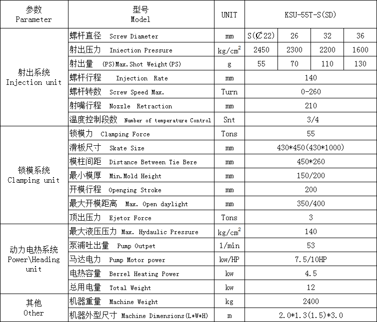 眼鏡單滑板注塑機(jī)KSU-55T-S參數(shù):